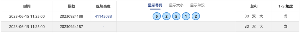 在下一个开奖时间后,最快收到的特定区块高度,将使用它的哈希值作为开奖结果。